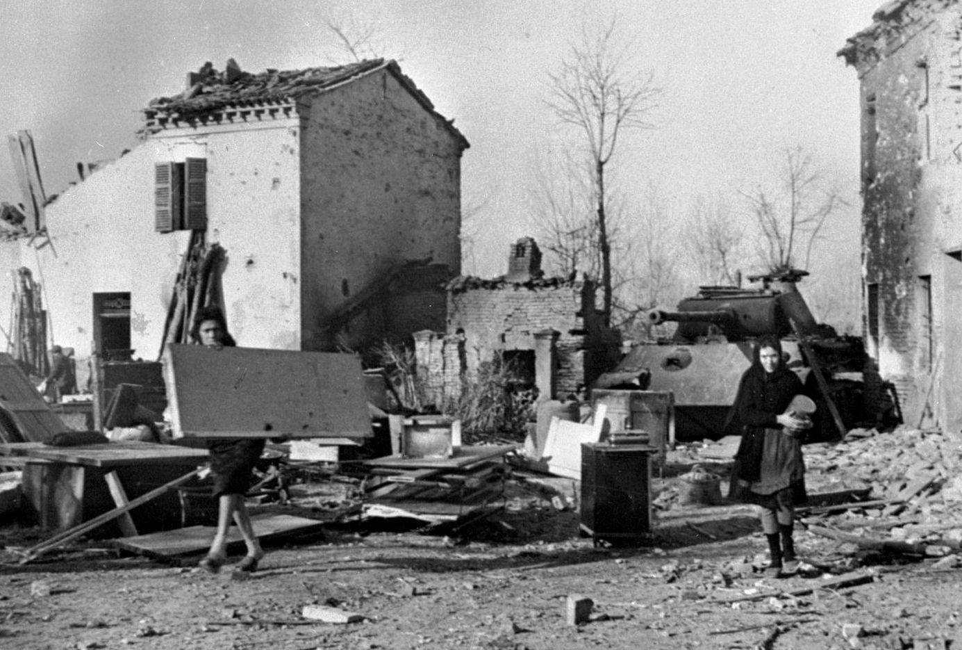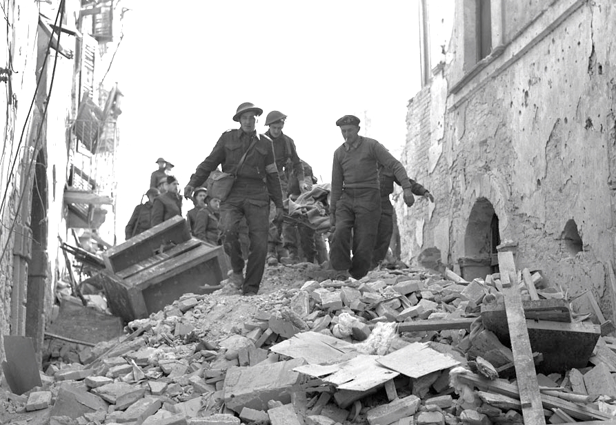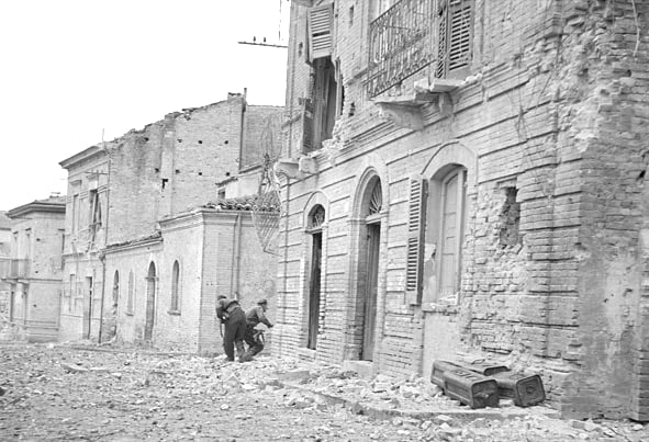 Two Canadian soldiers cautiously rounding the corner of a ruined building in Ortona, Italy, 1944.