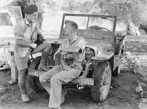 Sergeants Al Grayston and Jack Stollery MM respectively, with film cameras and a jeep in Sicily, 1943. Grayston shot the first footage of the landings in Sicily. Stollery was awarded the MM for his disregard of enemy fire when filming in Ortona.