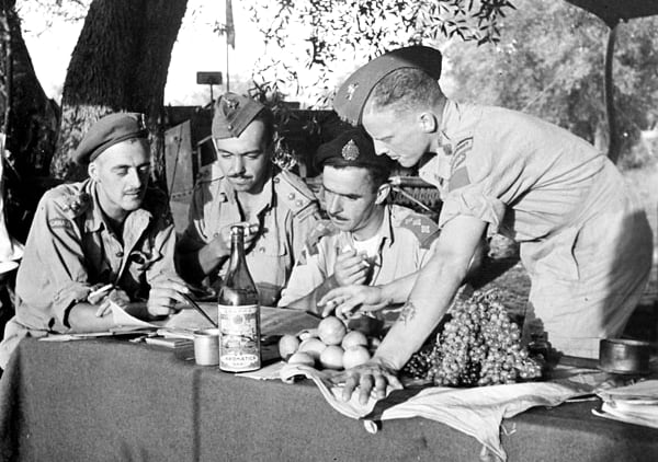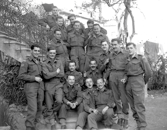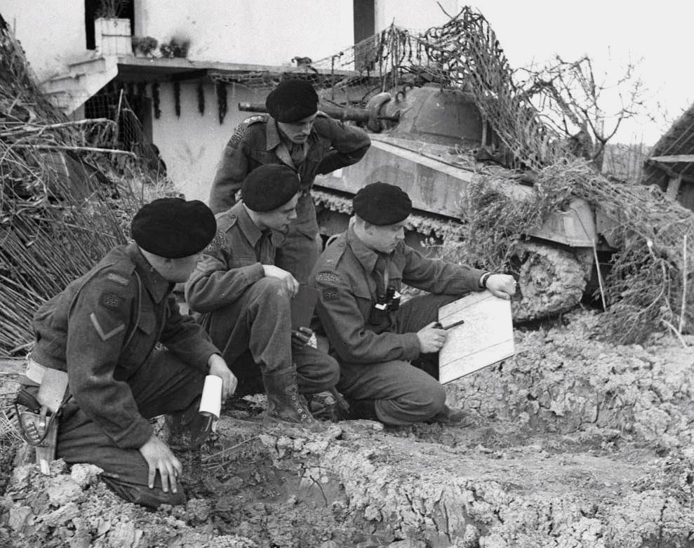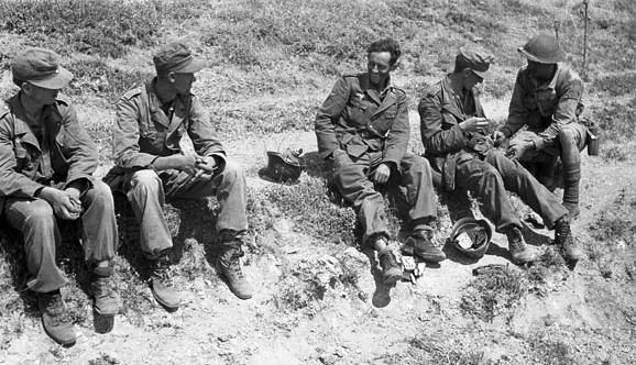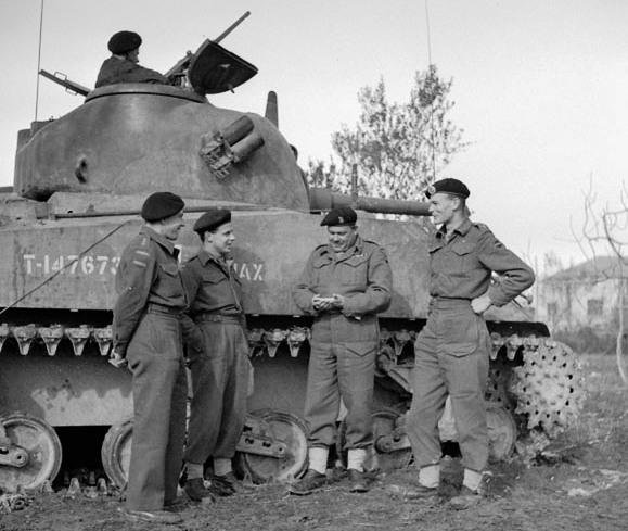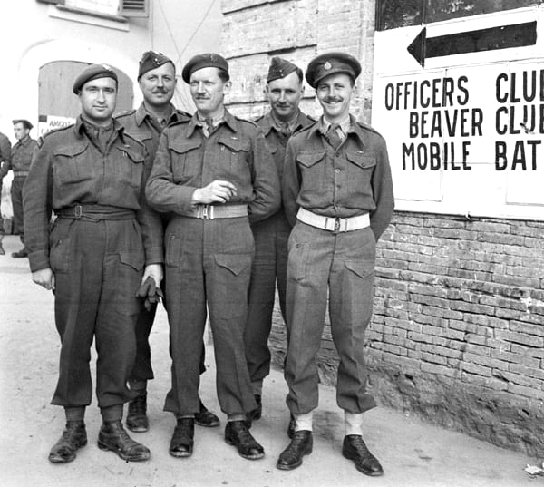 L-R: RCR Captain Sam Lerner, RCR Captain R. B. Watson, Major M.H. Hodgins, Captain J.A. Johnston and Captain J.L. Morrison, all from London, Ontario, at San Vito Chietino, Italy, 4 February 1944. After the war, Sam Lernerer became the war Honorary Colonel RCR.