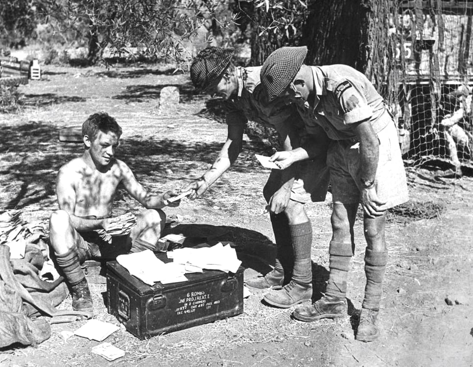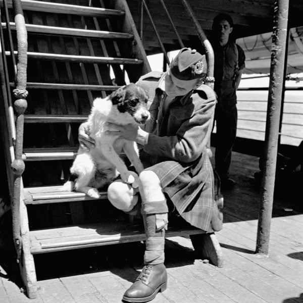 Private Peter Bross, and mascot Bob, of the Cameron Highlanders of Ottawa, aboard the troopship HMT Nea Hellas en route to Philippeville, Algeria, 8 July 1943. This is interesting. The Cameron Highlanders of Ottawa fought in North West Europe, not in Italy – and yet this soldier is certainly wearing their cap badge in the Mediterranean.
