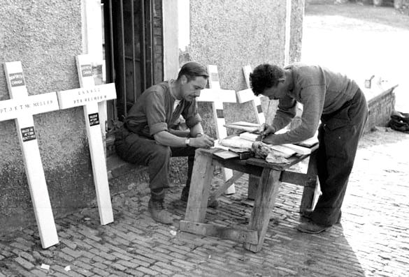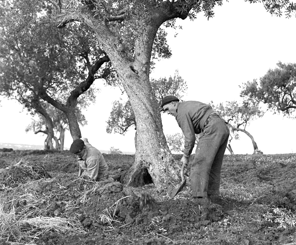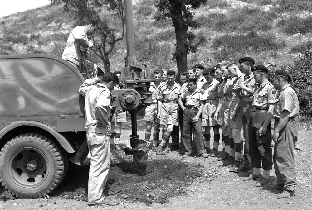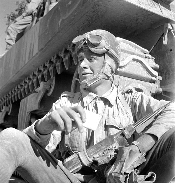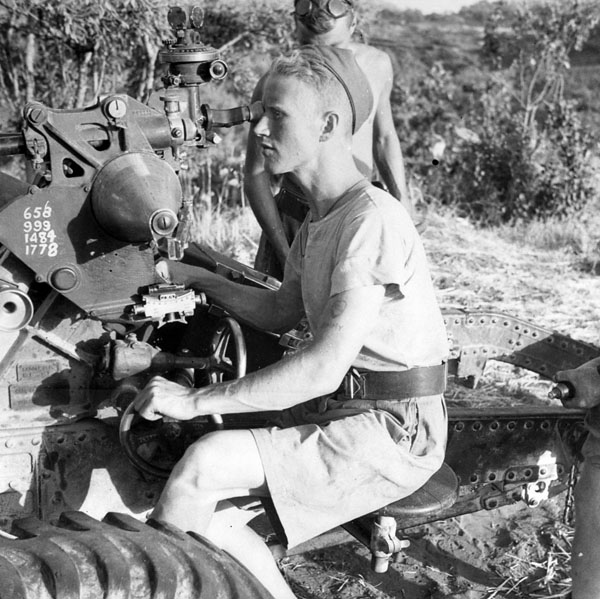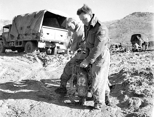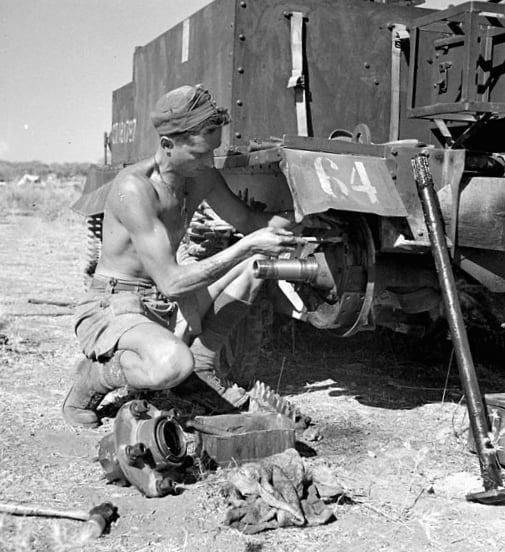 Private R.E. Hill (possibly with the Saskatoon Light Infantry), repairing his Universal Carrier, Catania, Italy, 22 August 1943. It appears that more than brake repair is needed, as the axle shaft is sitting upright, leaning on the front of the vehicle. Possibly the differential gears were stripped? The axle splines look battered. (Jim Bunting)