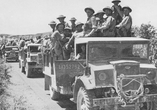 Overcoming light resistance on the beaches after landing in Sicily on 10 July 1943, the 1st Canadian Infantry Division units pushed rapidly inland for first few days of Operation HUSKY. Troops with CMP trucks.