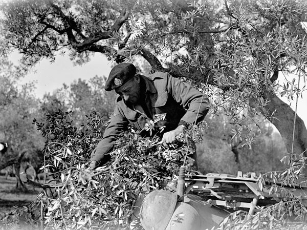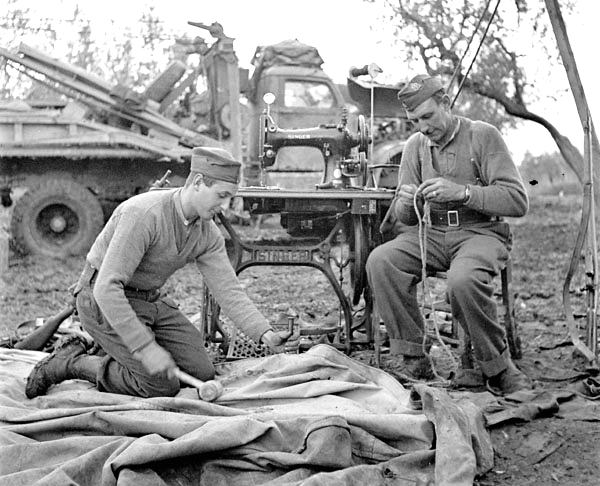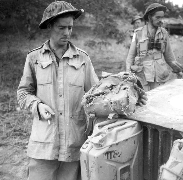 Canadian despatch rider holding regimental shoulder flashes during the assault on the Gothic Line, Italy, ca. 26 August – 3 September 1944. He is sewing them back on after removing them for the Candian’s move from the Florence area, to the Adriatic coast in preparation for the attack on the Gothic Line.