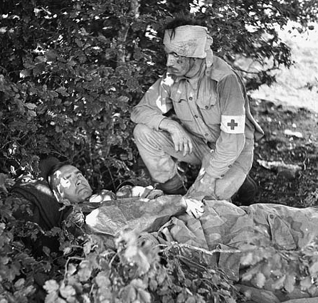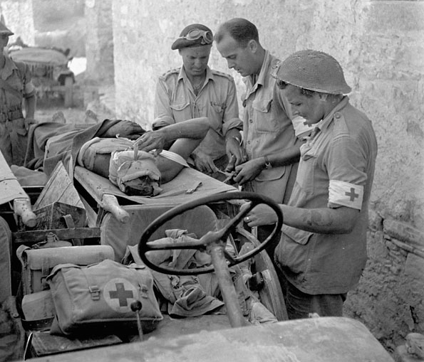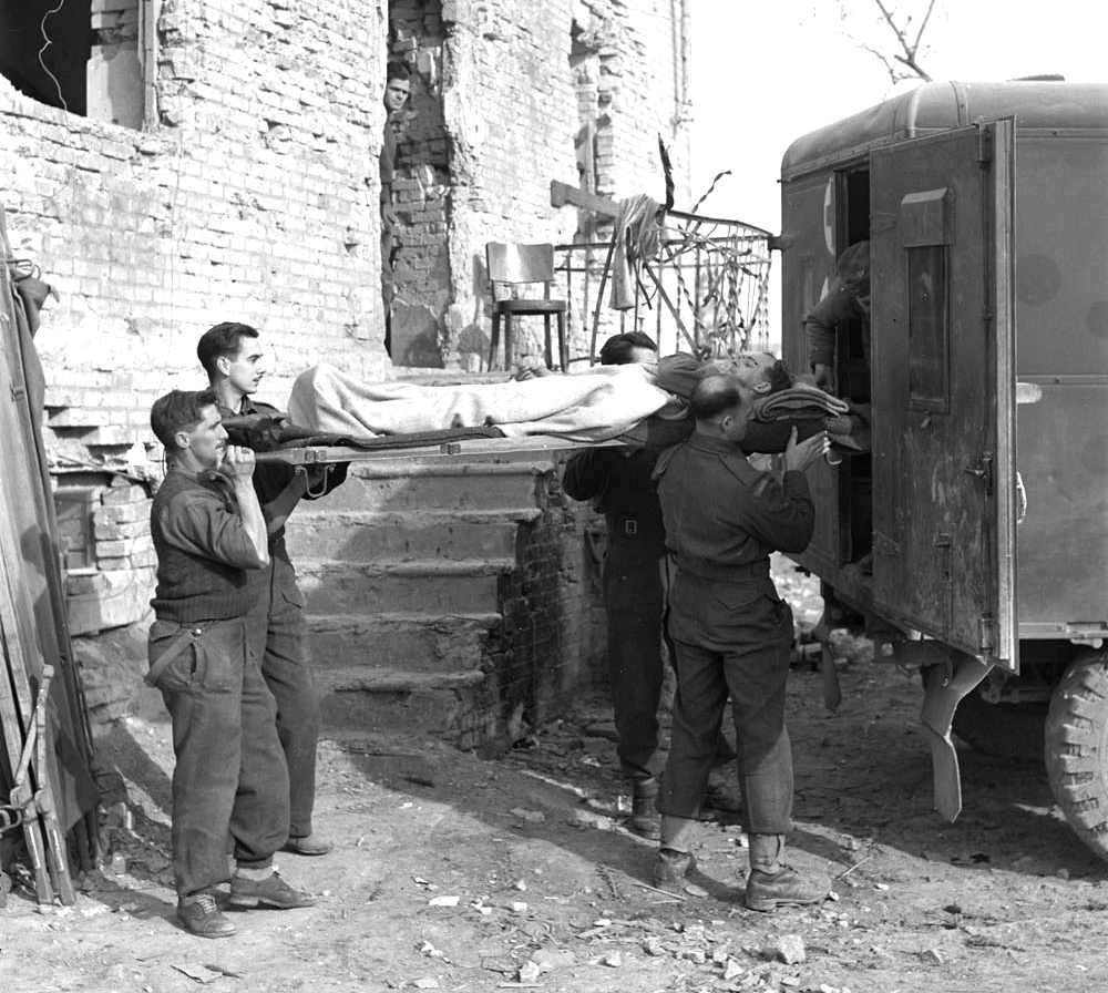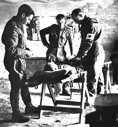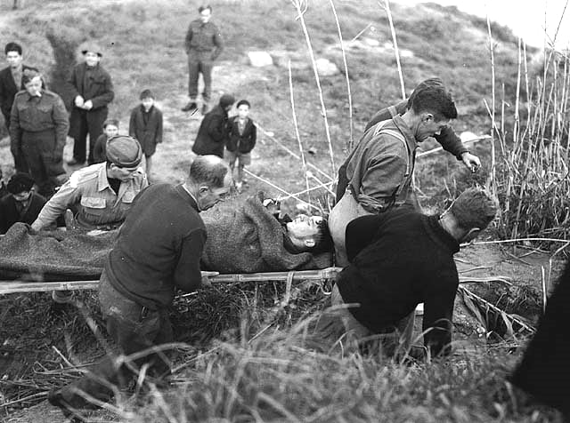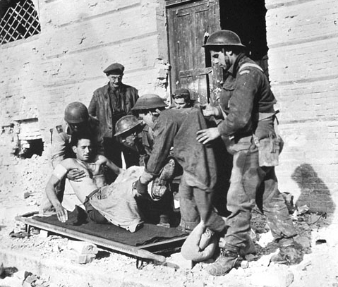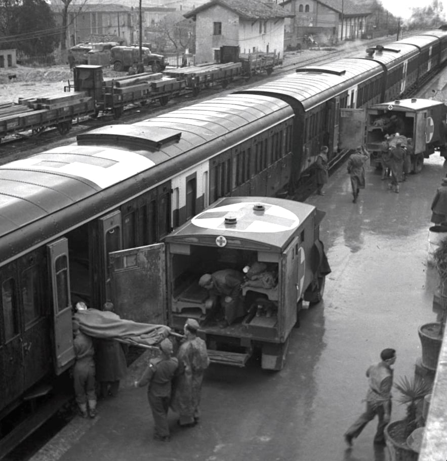 Transferring casualties from an ambulance to a hospital train, Barletta-Andria area of Italy, Feb 1944.