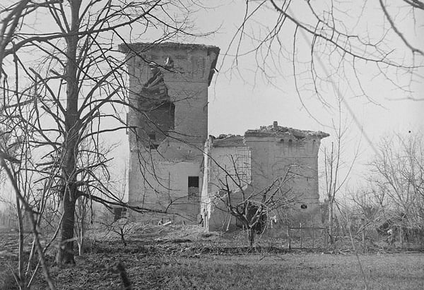 From the Pachino beaches, where resistance from Italian coastal troops was light, the Canadians pushed forward through choking dust, over tortuous mine-filled roads. At first all went well, but resistance stiffened as the Canadians were engaged increasingly by determined German troops who fought tough delaying actions from the vantage points of towering villages and almost impregnable hill positions. On 15 July, just outside the village of Grammichele, Canadian troops came under fire from Germans of the Hermann Goering Division. The village was taken by the men and tanks of the 1st Infantry Brigade and Three Rivers Regiment.