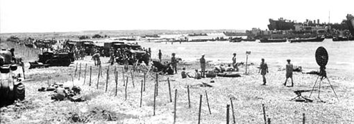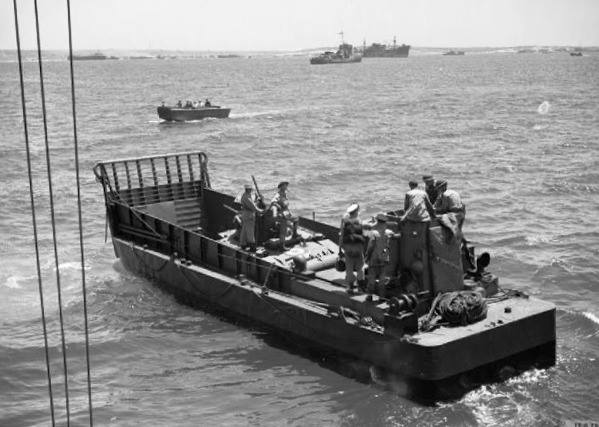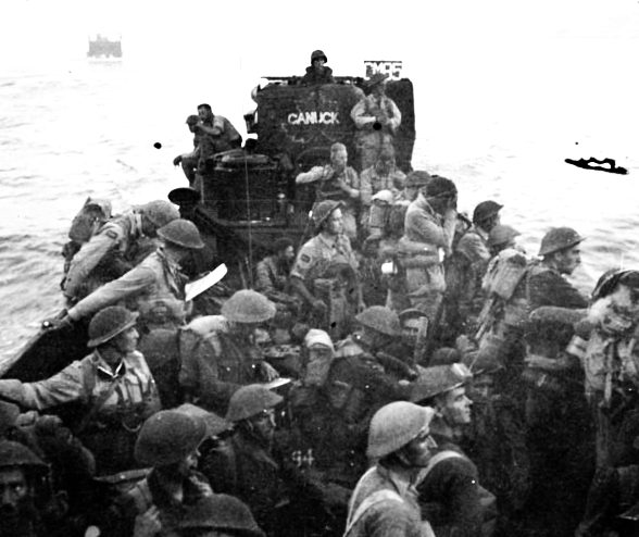 The Royal 22e Regiment landing on the beach at Reggio di Calabria on the morning of 3 September 1943. The 80th and 81st Landing Craft Mechanized Flotillas, RCN, transported the R22eR across the straits of Messina departing from Catania’s port. LCMs are pictured in the photo. (David Patterson)