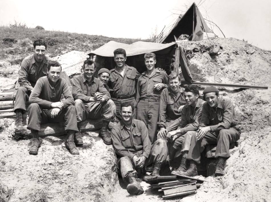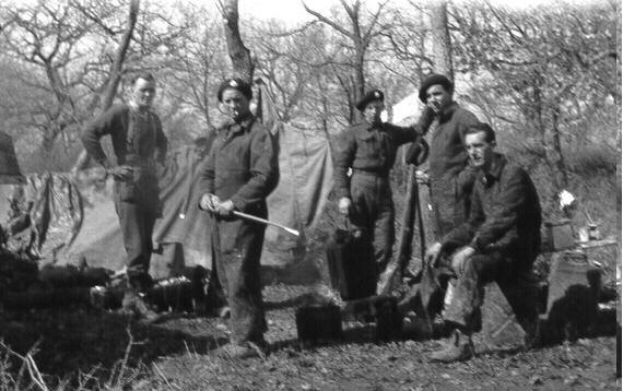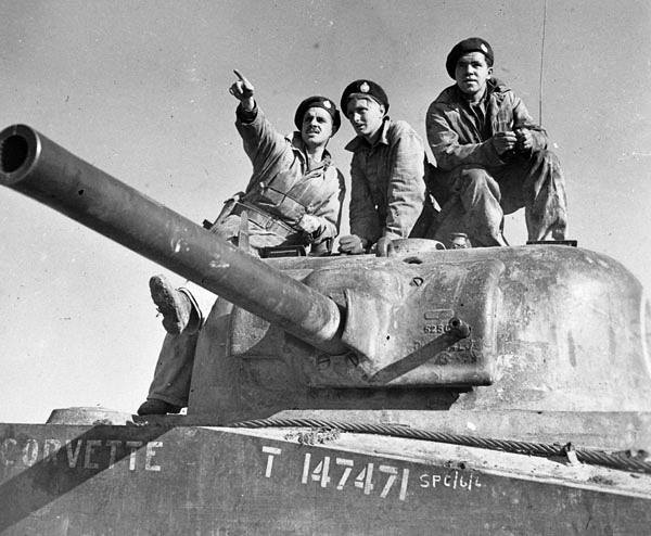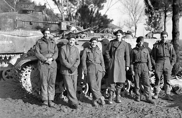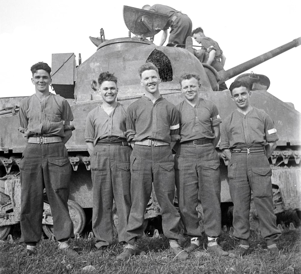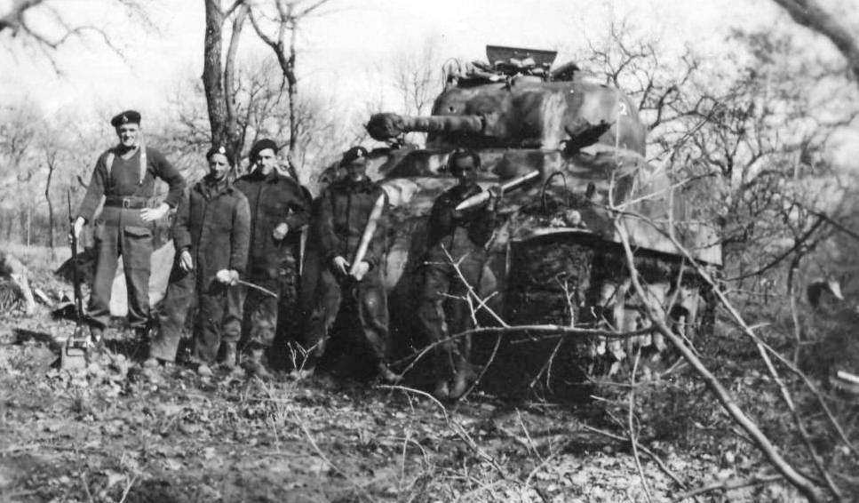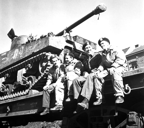 Troopers Ed Owles, Jim Simmons, Sandy Cartner and Harry Clark from “B” Squadron, the Ontario Regiment, with a Sherman tank on a railway flatcar en route from Italy to Northwest Europe, Mouscron, Belgium, 24 March 1945.