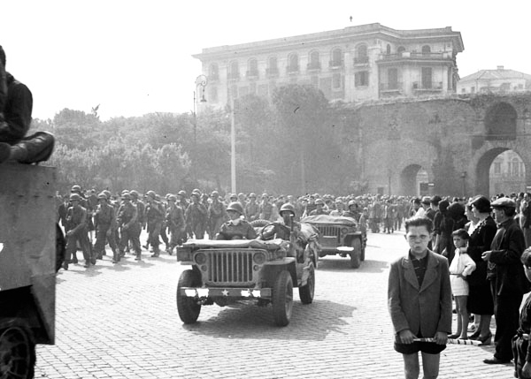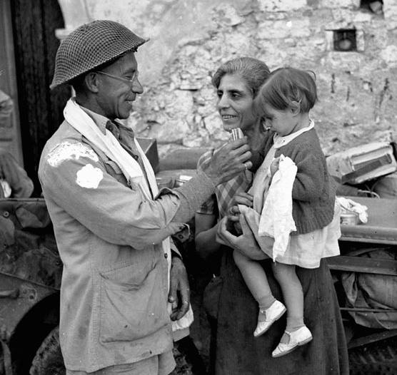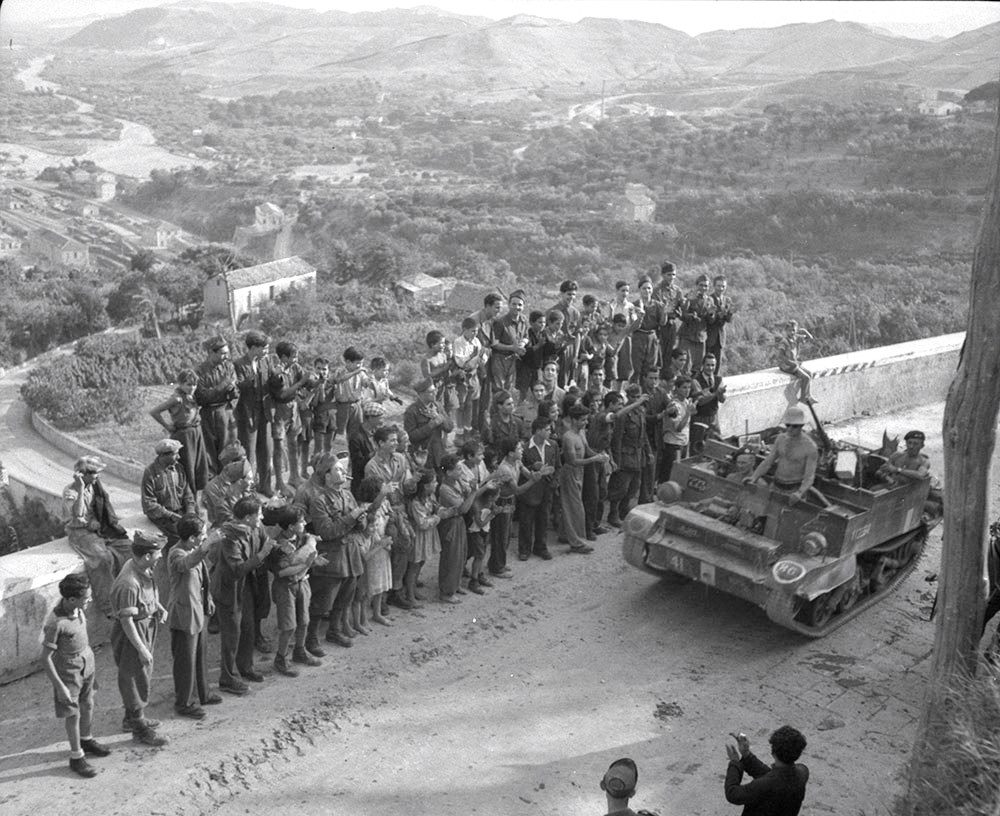 Italians welcome Canadian troops at the entrance of Catanzaro.