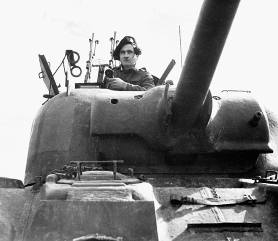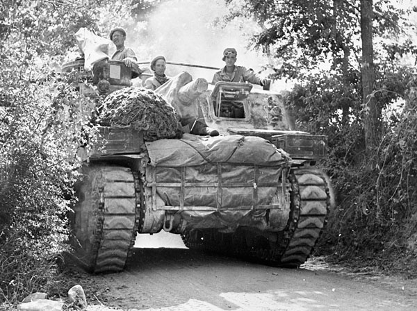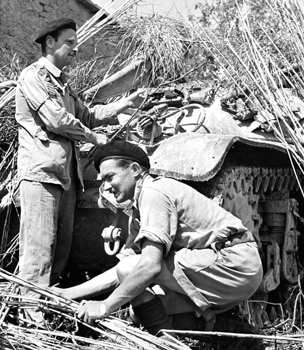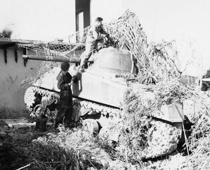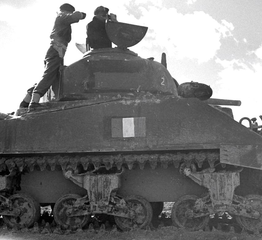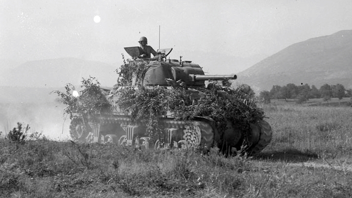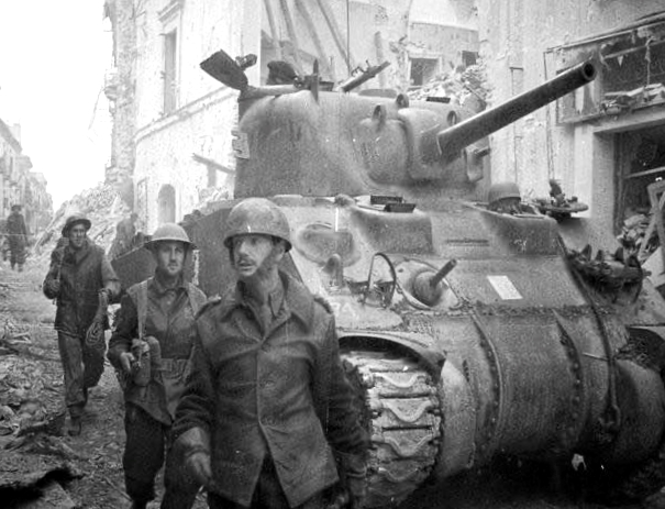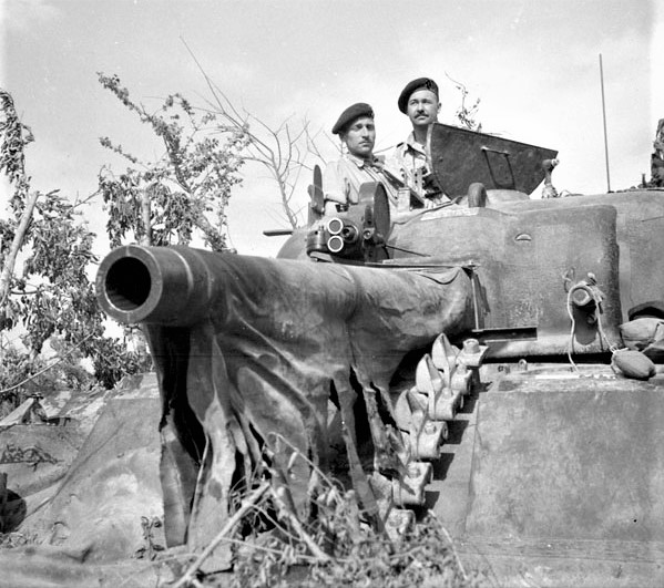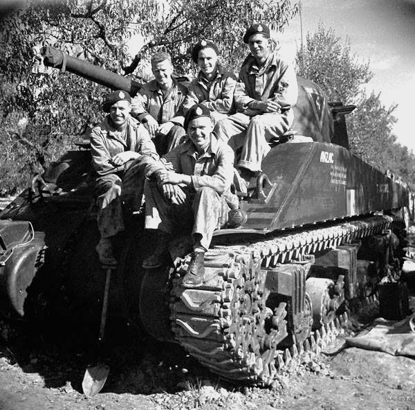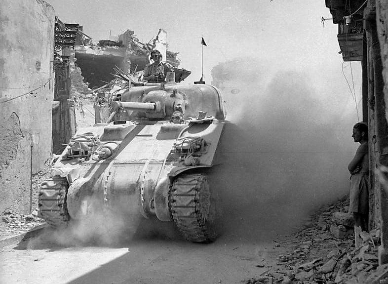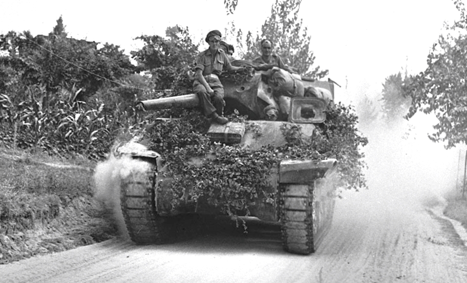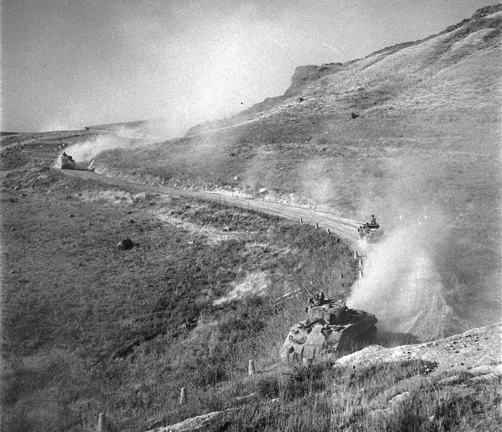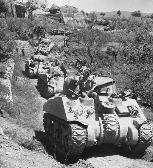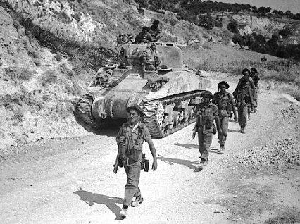 Sherman V tank with the 11th Canadian Tank Regiment (The Ontario Regiment) advancing near Catania, Sicily, 4 August 1943.