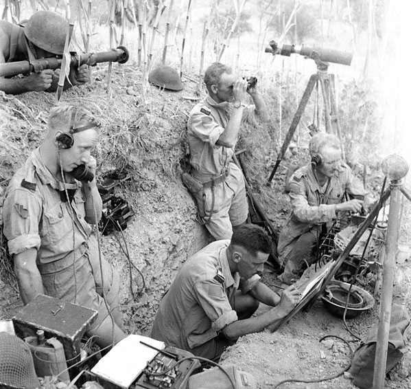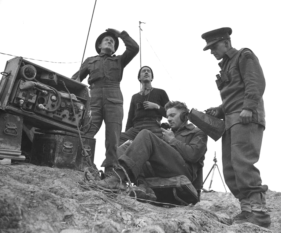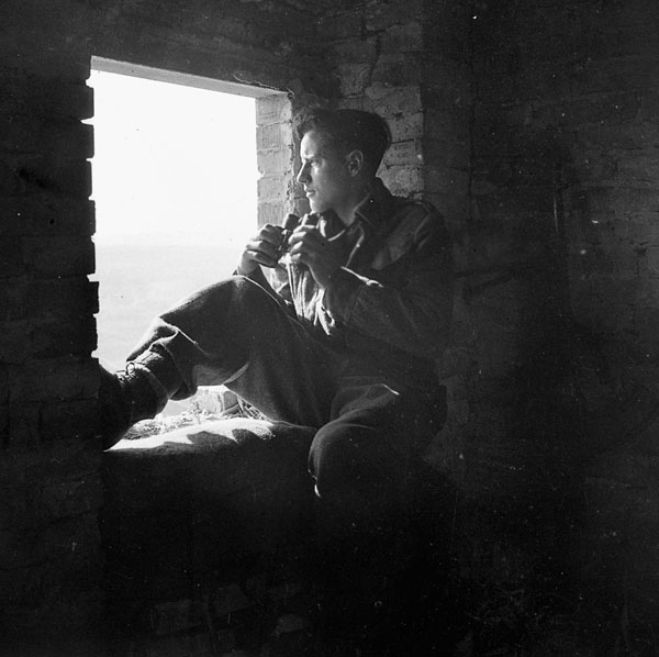 Front Line – North Nova Scotia Regiment, 9th Canadian Infantry Brigade – Furthermost Canadian outpost – ‘Arty’ O Pip sighting for a shoot, 1,000 yds from the enemy, 22 June 1944.