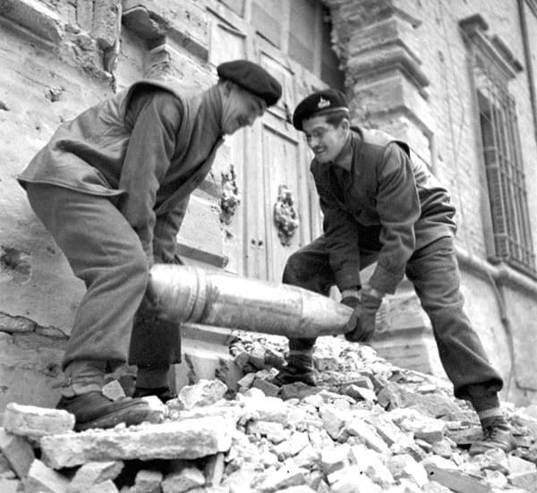 Troopers W. Ballinan and A. Gallant of the Royal Canadian Dragoons carrying an unexploded 6-inch naval artillery shell (likely fired by an American light cruiser off the coast), at the request of Allied Military Government, Bagnacavallo, Italy, 3 January 1945.
