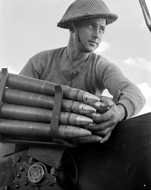 Gunner V.C. Northey, loading 40-mm Bofors AAA rounds, 5th Battery, 2nd Light Anti-Aircraft Regiment, RCA, Campobasso, Italy, 29 October 1943.