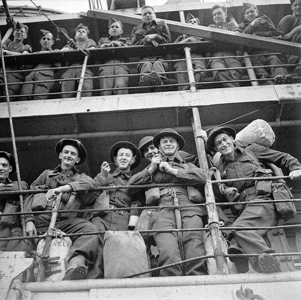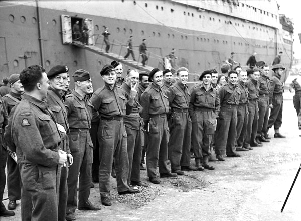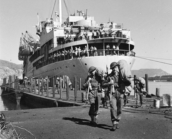 Personnel of Headquarters Company, No. 2 Canadian Base Reinforcement Depot (Canadian Army Miscellaneous Units), who survived the sinking of SS Santa Elena, disembarking from the SS Monterey at Naples, Italy, 8 November 1943.