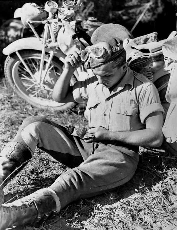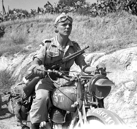 Canadian Provost Corps motorcyclist with the 5th Canadian Division at Orsogna, Italy, 27 January 1944.