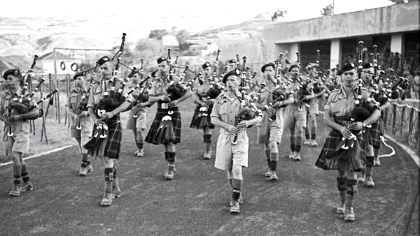 Seaforth Highlanders on the March, en route to a Brigade Inspection by General Sir Bernard Montgomery, Militello, Sicily, 20 Aug 1943.