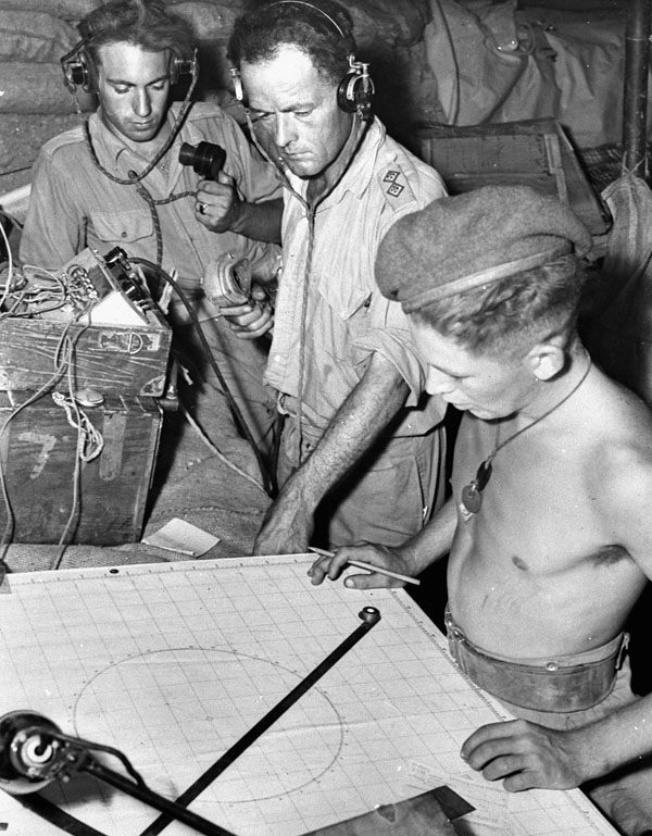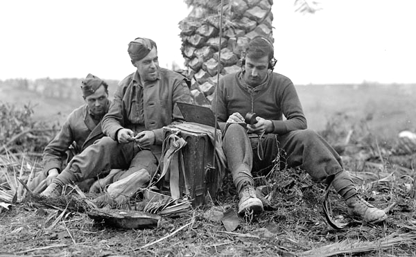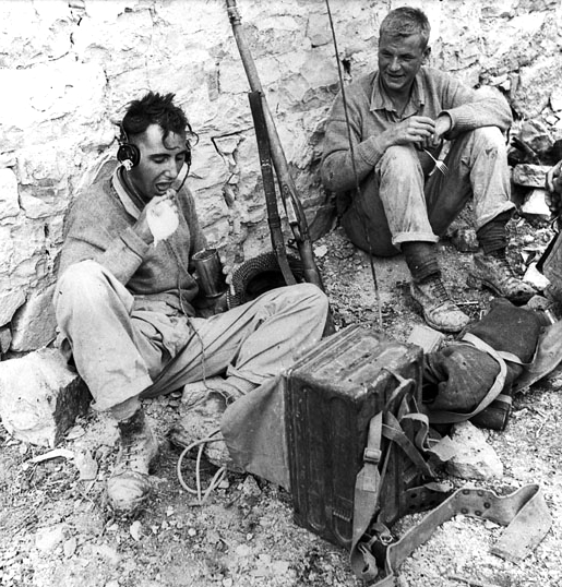 Engineer Paul Johnston of the Canadian Broadcasting Corporation setting up equipment to record a broadcast by CBC correspondent Matthew Halton, Catangora, Italy, 14 September 1943. The piece of equipment in front of the sound engineer is a acetate disc cutter that takes the sound from the microphone and puts it into the disk. In the later stages on the war the CBC experimented with dictaphone wire recorders as they were more light weight and produced an acceptable recording for rebroadcast back home in Canada. The Canadian Army photo and motion picture units focused on visual productions, while the CBC did sound recording of military actions. (Jim Bunting)