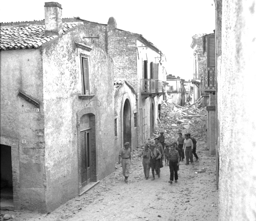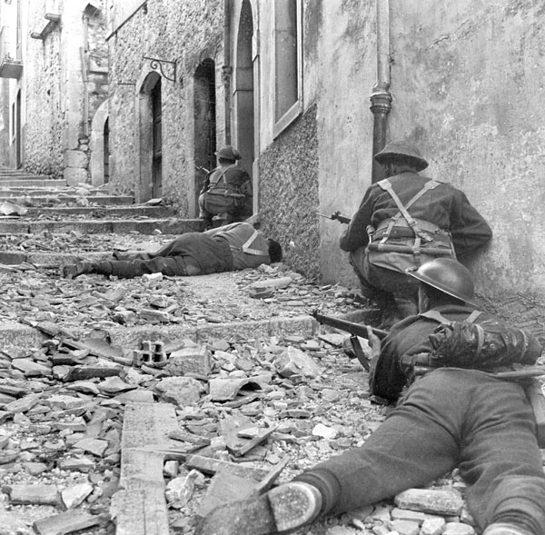 Canadian soldiers likely scanning the upper windows for Germans in the streets of a town in Sicily in 1943.