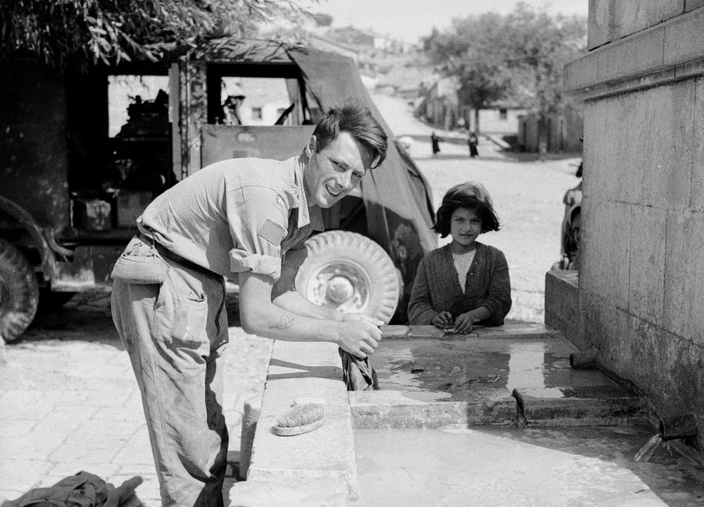 Cpl Smokey Atkinson cleaning the grime off a hand grenade, Ortona, Italy, 1943.