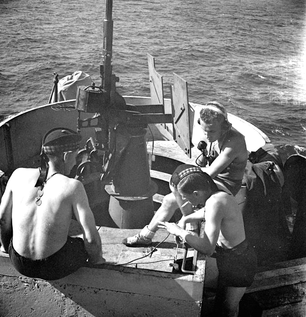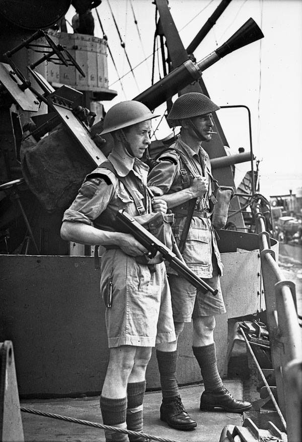 Infantry reinforcements of the 48th Highlanders of Canada next to a 20-mm Oerlikon anti-aircraft gun on board HMT Nea Hellas en route to Philippeville, Algeria, 5 July 1943.