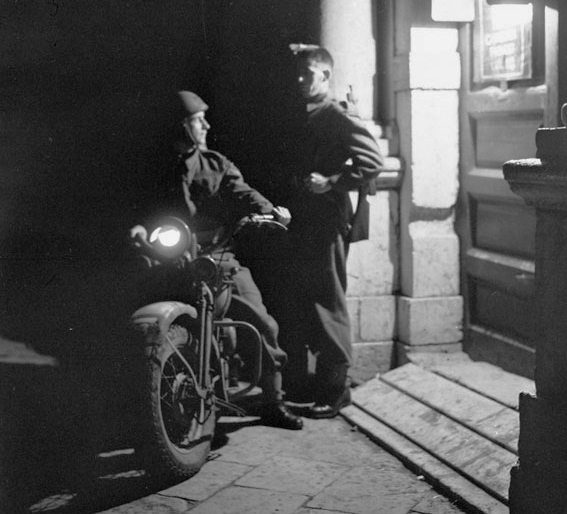 Corporal Joe Babcock (left) talking with Private Herb Thompson, both of the Canadian Provost Corps, at Provost Detachment Headquarters before starting his nightly motorcycle patrol of Taormina, Sicily, Italy, December 1943.