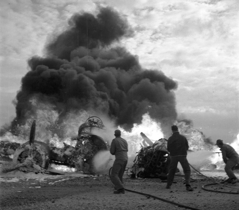 Firefighters hosing down a crashed Italian Savoia-Marchetti SM.79 Sparviero three-engine bomber, possibly at an RCAF forward operating strip on the Italian front, Dec 1943.