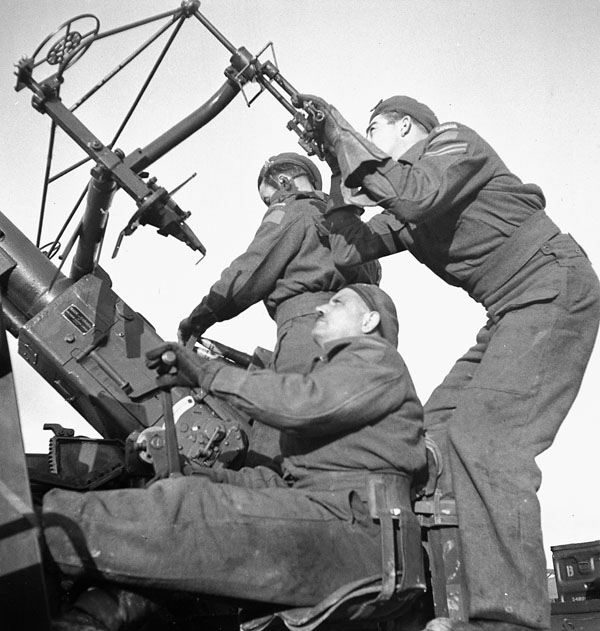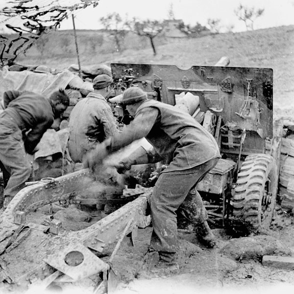 Gunners of the Royal Canadian Artillery with a Canadian-made 40-mm Bofors anti-aircraft gun mounted on a Canadian-made Ford chassis, Russi, Italy, 18 February 1945.