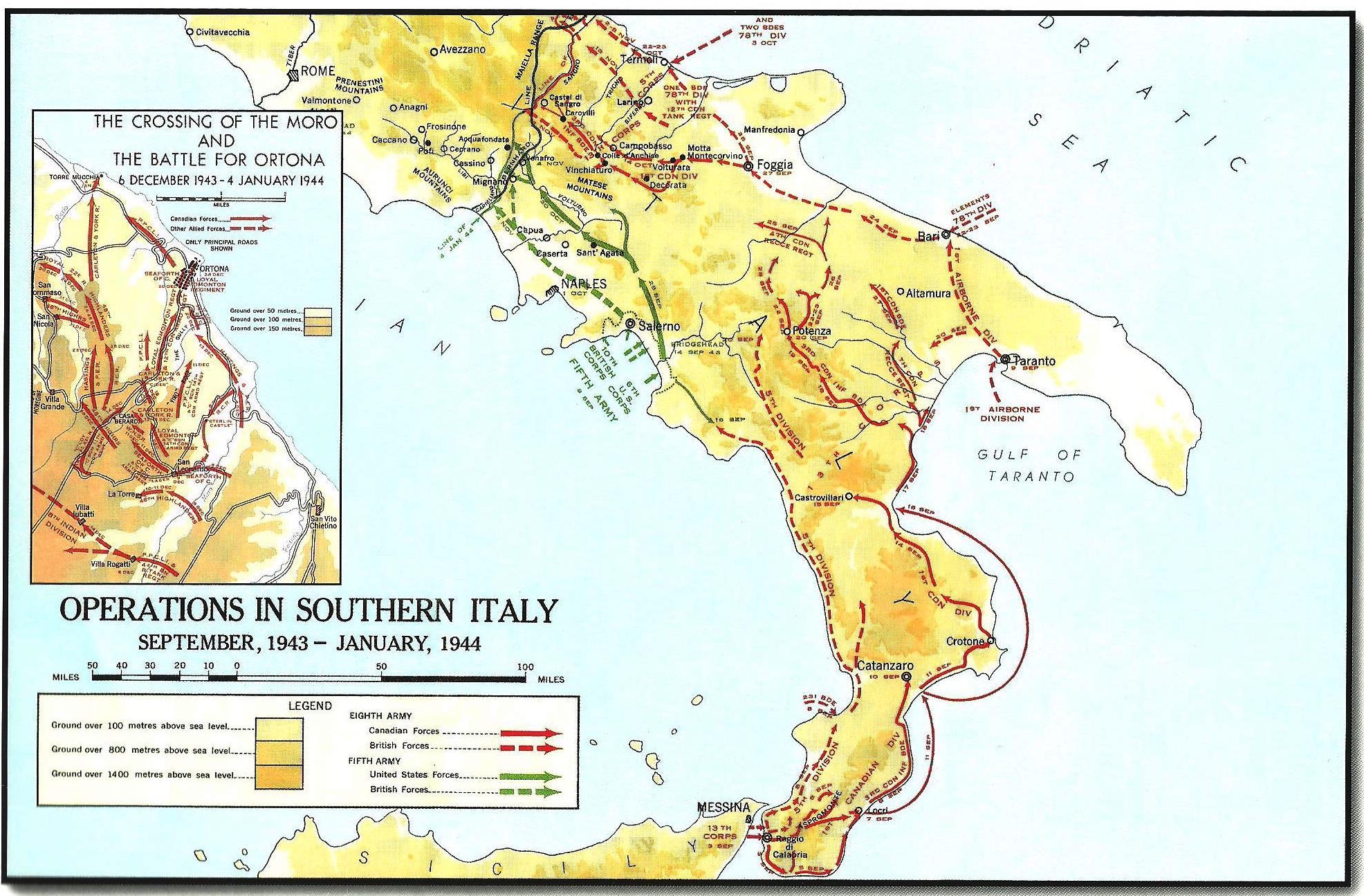 Map of Allied operations in Southern Italy, September 1943 to January 1944. (Map drawn by C.C.J. Bond, in C.P. Stacey, The Canadian Army 1939-1945: An Official Historical Summary (1948), Department of National Defence)