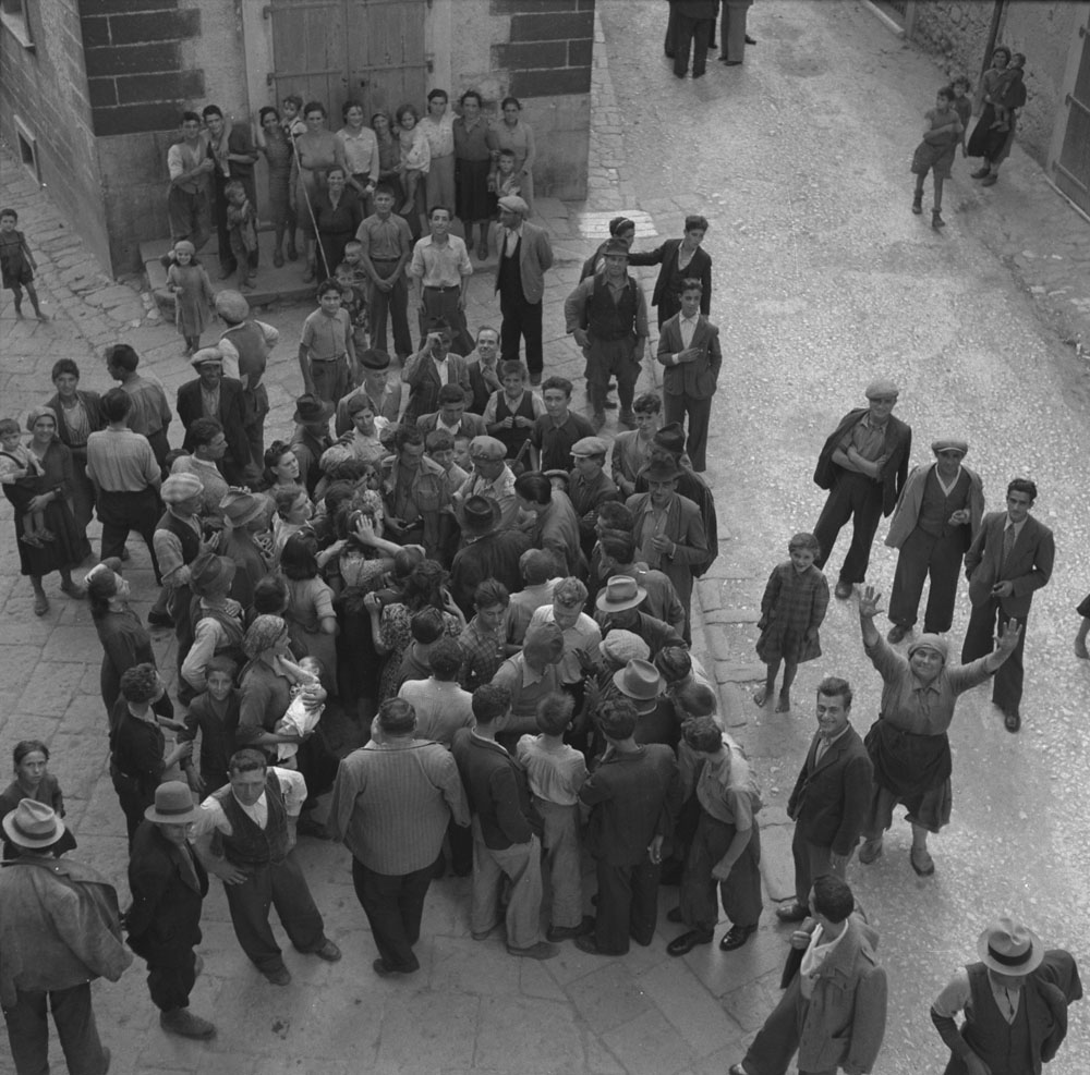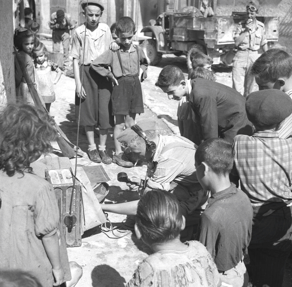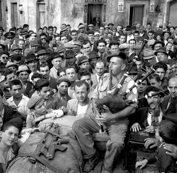 Piper Roderick Grant of the 48th Highlanders of Canada playing his bagpipes for a crowd of liberated civilians, Matera, Italy, 24 September 1943.