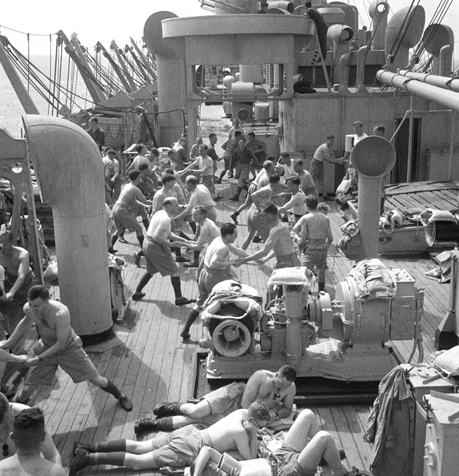 Canadian troops in unarmed-combat practice on board His Majesty’s Transport possibly HMT Dunera during the troop convoy to the Mediterranean Theatre, 1 July 1943. Possibly also HMT Rohna, both of which took part in the Sicily landings in 1943.