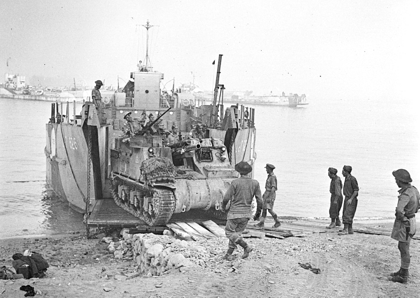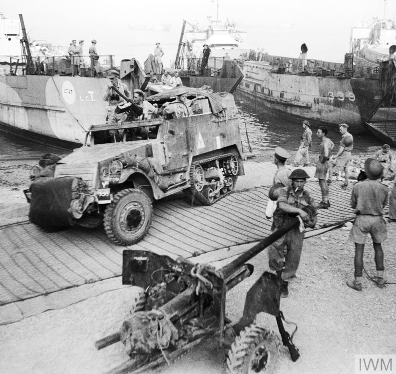 A half-track and 6-pdr anti-tank gun coming ashore from landing craft at Reggio, 3 September 1943.