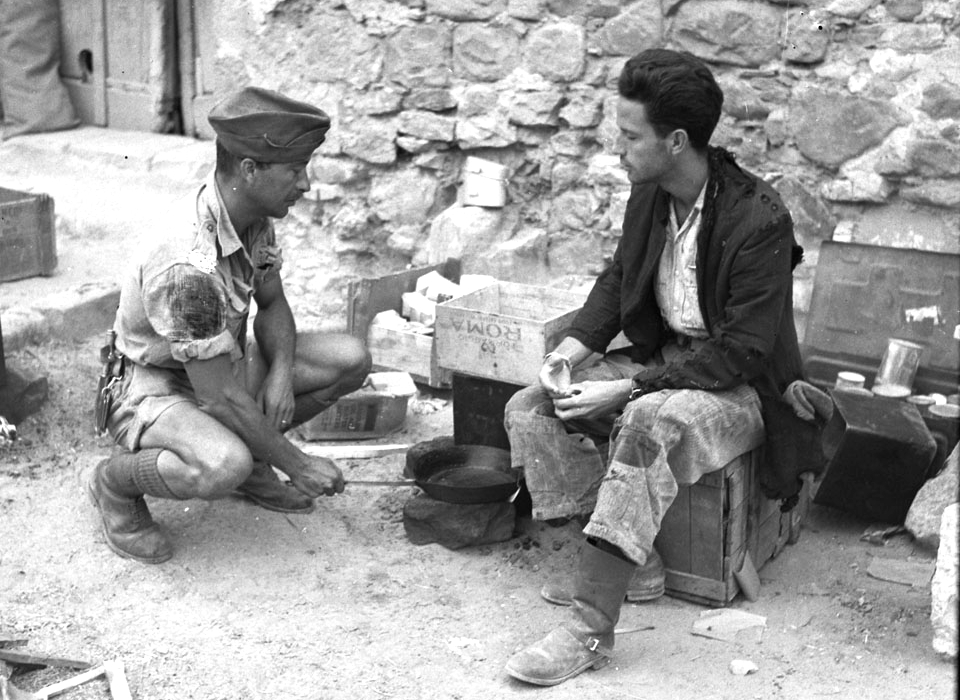Private Dave King, a driver with the Canadian Army Film and Photo Unit, talking with an Italian who lived in his own hometown of Burlington, Ontario, for a number of years, Delianuova, Italy, ca. 5 September 1943.