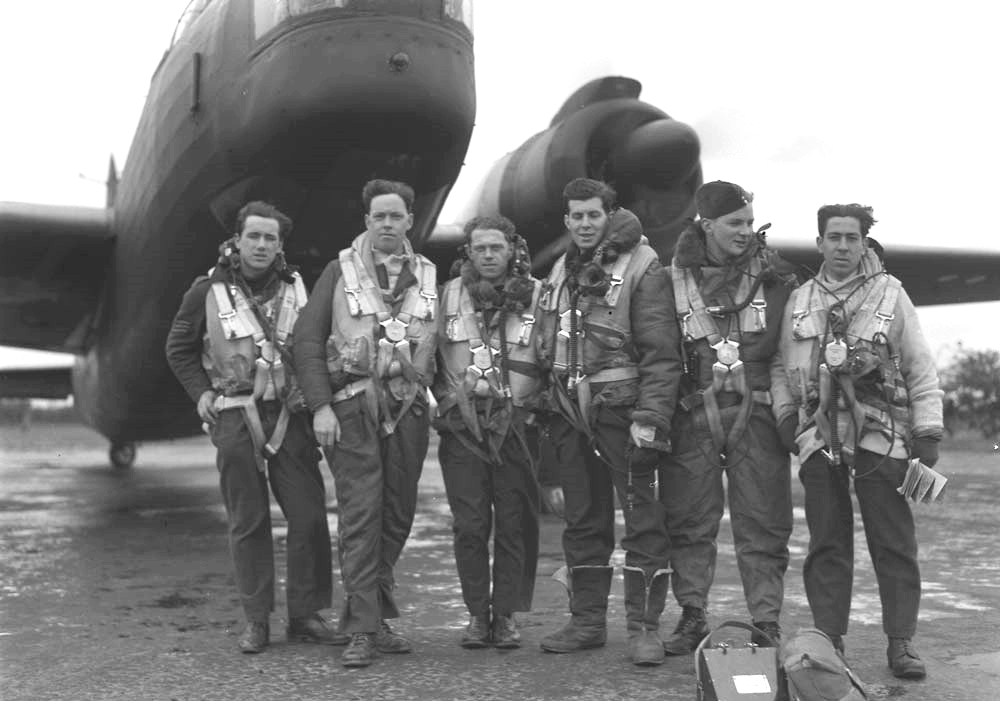 Vickers Wellington bomber with its aircrew, Flight Sergeant Roland Dallaire, Flight Lieutenant Saint-Pierre, Flight Sergeant André Péloquin, and Pilot Officer Don Larivière. No. 425 “Alouette” Squadron, RCAF, 1942-1943.