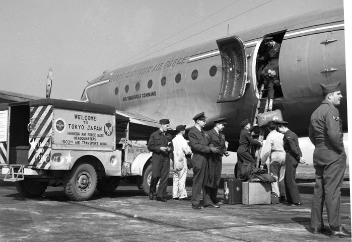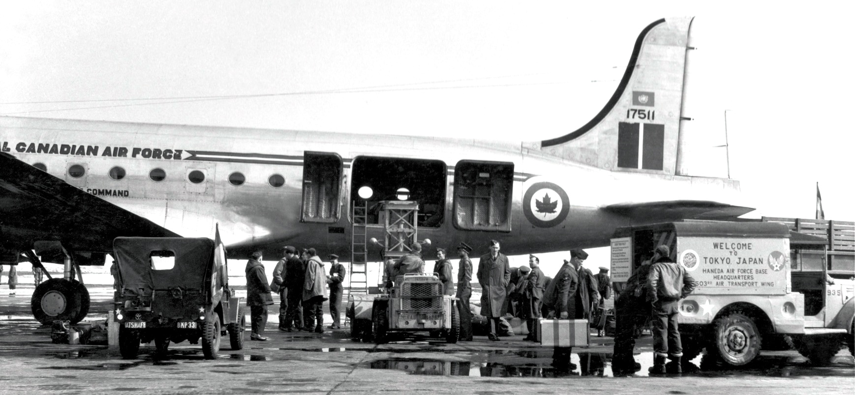 The crew of a Canadair CL-2 North Star, No. 426 Squadron, unloading baggage at Haneda Air Base near Tokyo after a flight from McChord Field.  The Canadian contribution to the air effort during the Korean War began early in the war when 426 Transport Squadron was attached to the USAF’s Military Air Transport Service.  It moved to McChord Air Force Base in Washington to carry out its duties.  The squadron flew Canadair 12 “war strength” North Stars (similar to the C-54GM), on 599 round trips over the north Pacific, transporting 13,000 personnel and three million kilograms of freight and mail to Japan.  There, cargo was offloaded for onward transit to Korea.  The intense, challenging route, which involved long legs over open water, terrible weather and a treacherous landing strip at the midway point in Alaska, took them perilously close to the Soviet Union.  Although there were some close calls and incidents, there were no fatalities and no cargo was lost during the airlift.  (RCAF in Korea, 1950-1953)