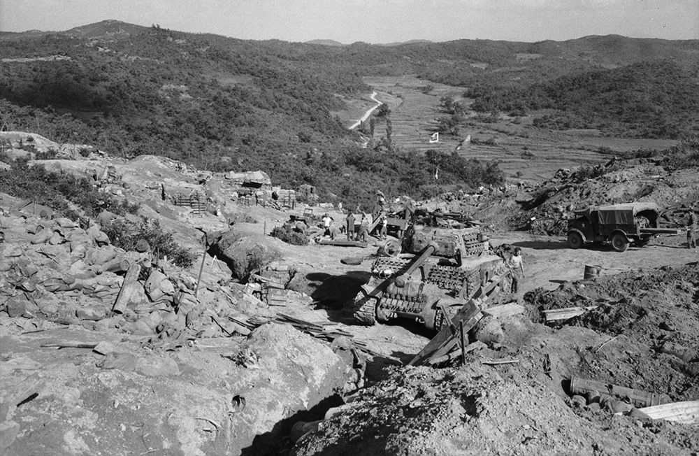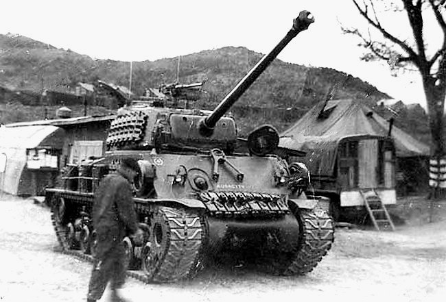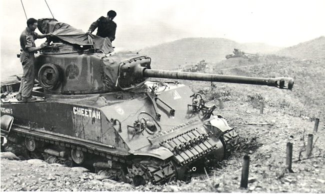 M4A3E8 Sherman Tank of Company B, 72nd Tank Battalion, 2nd Infantry Division, US Army firing its 76-mm gun at enemy bunkers on “Napalm Ridge”, in support of the 8th ROK Division, 11 May 1952. Note the prepared firing position, with ammunition cases piled at left, and sandbags piled on the tank hull’s rear upper surfaces.  Canadians tanks fought in similar circumstances.