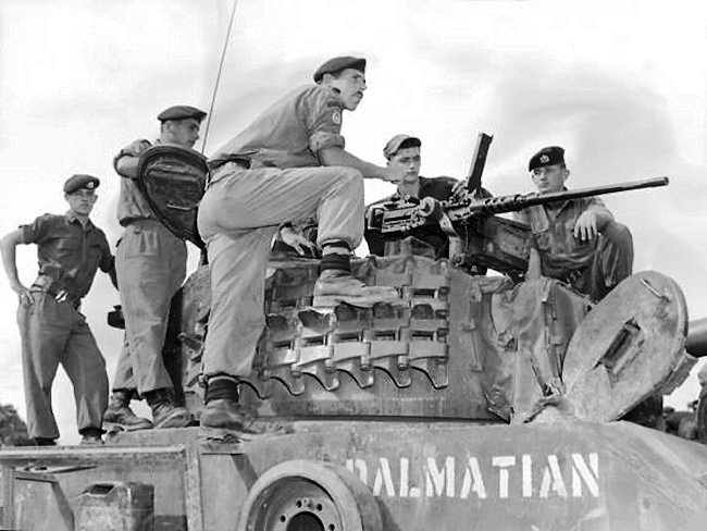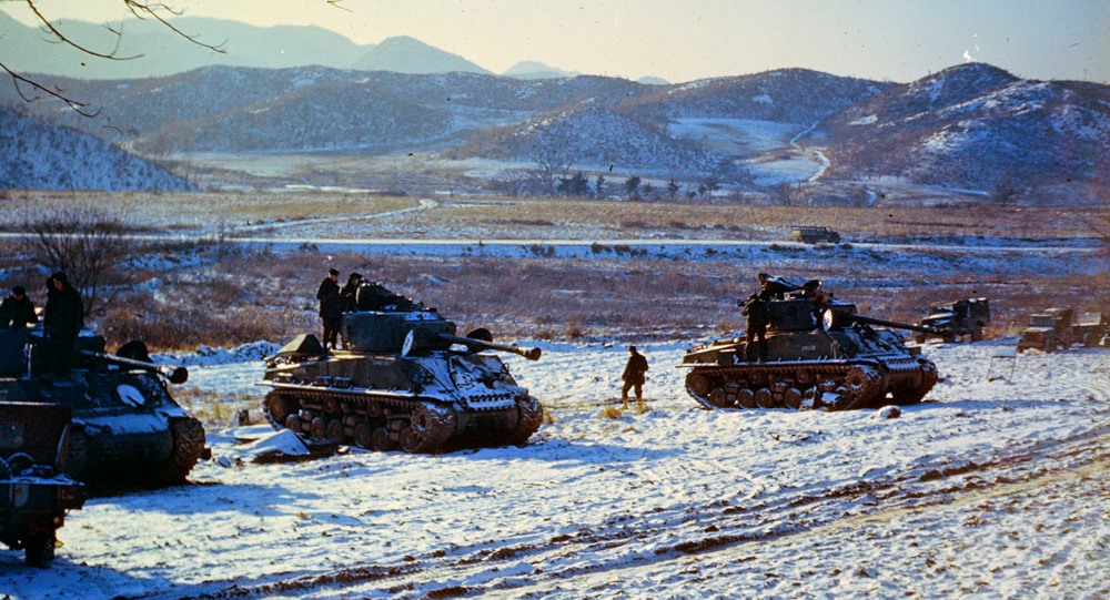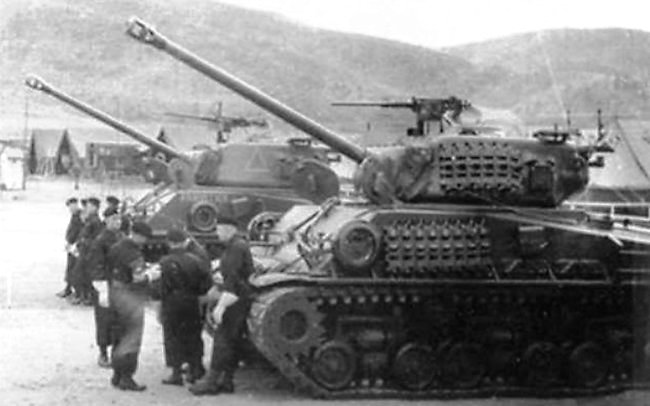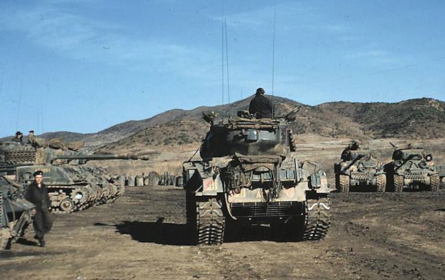 Canadian Sherman M4A3(76)W HVSS tanks of A Squadron, Lord Strathcona’s Horse (Royal Canadians), 2nd Armoured Regiment in Korea.