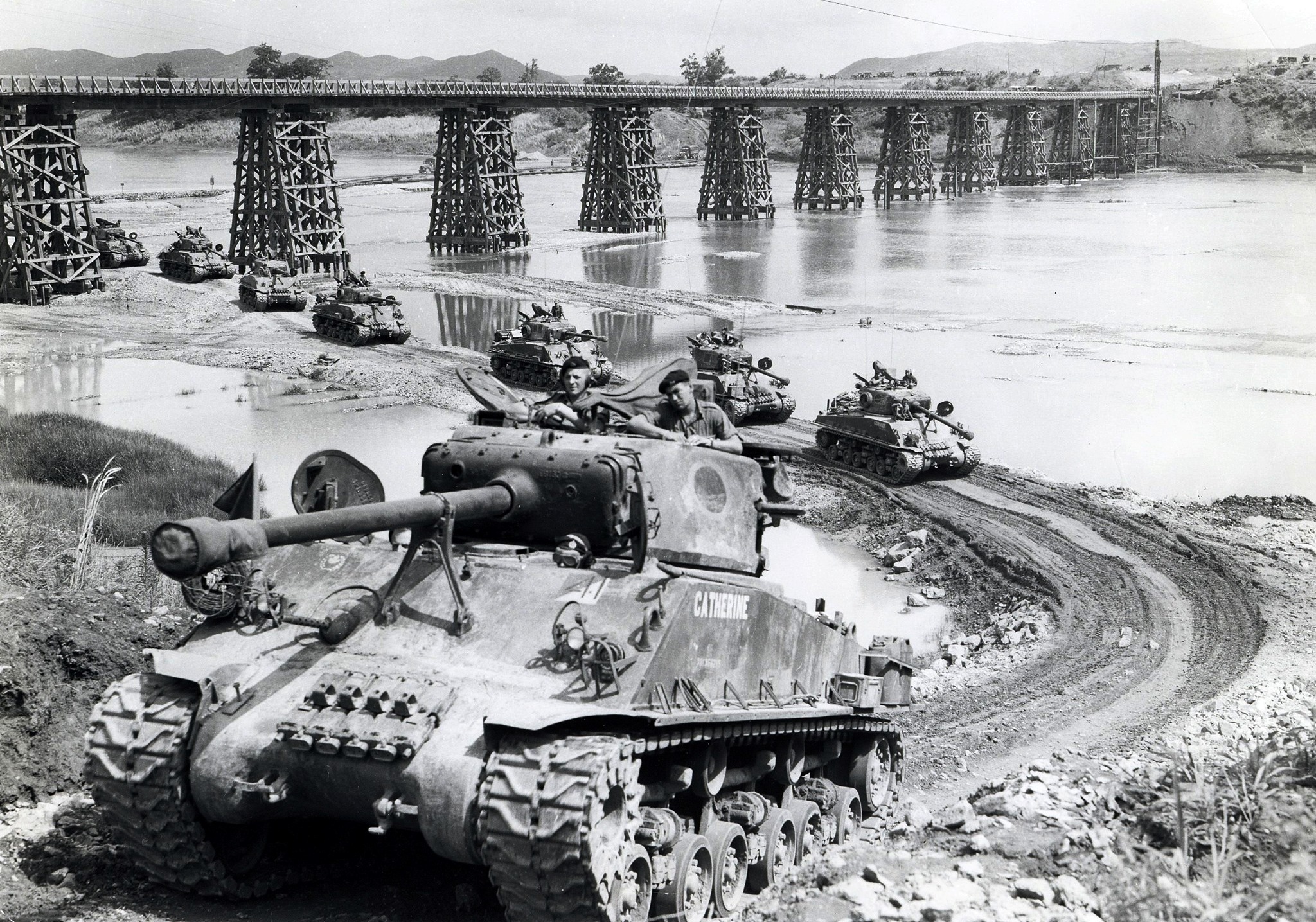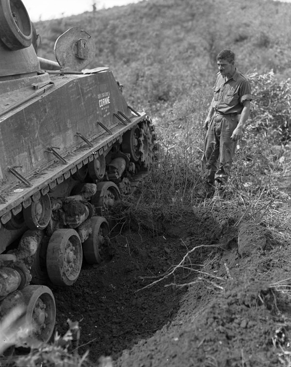 Canadian Sherman M4A3(76)W HVSS tank “Catherine“, B Sqn, LdSH (RC), Imjin River, Korea, 16 July 1952.  The tanks came from US Army stocks.  Canadians also deployed M10s in Korea.