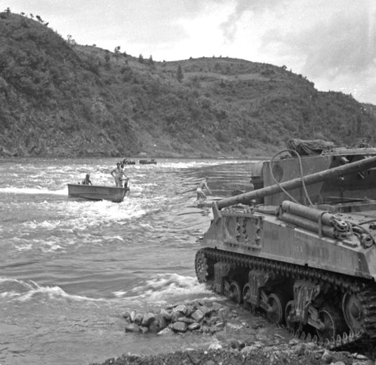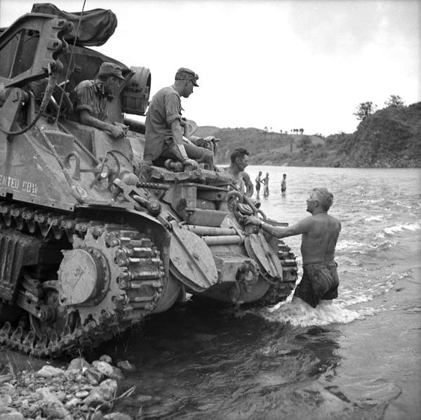 C SQN Lord Strathcona’s Horse (Royal Canadians), M32B3 VVSS armoured recovery vehicle (ARV) operations on the Imjim River, Korea, 25 July 1951.  The ARV’s name is “CONTENTENTED COW”, commanded by RCEME Sgt Gord Hunter.