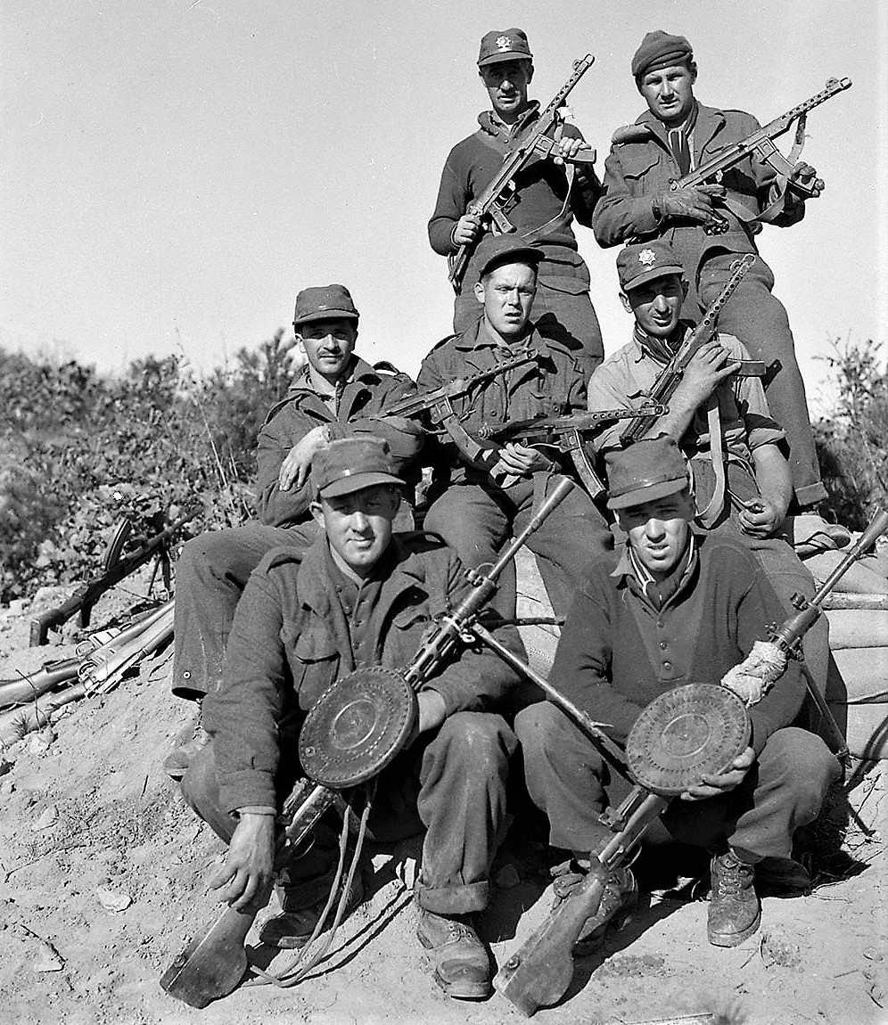 Soldiers of the 2nd Battalion, RCR in Korea, with captured Chinese weapons, (Front, L-R): Ptes. E.J. Paquette, Bill Brayley, (Centre, L-R): Ptes, Raymond Schiedel, Cliff Bertrom, L/Cpl. Ernie Lounsby, 3 November 1951. The two men in front are holding Degtyaryov DP-27 machine-guns, the five in the back are holding PPS-43 7.62-mm submachine-guns.