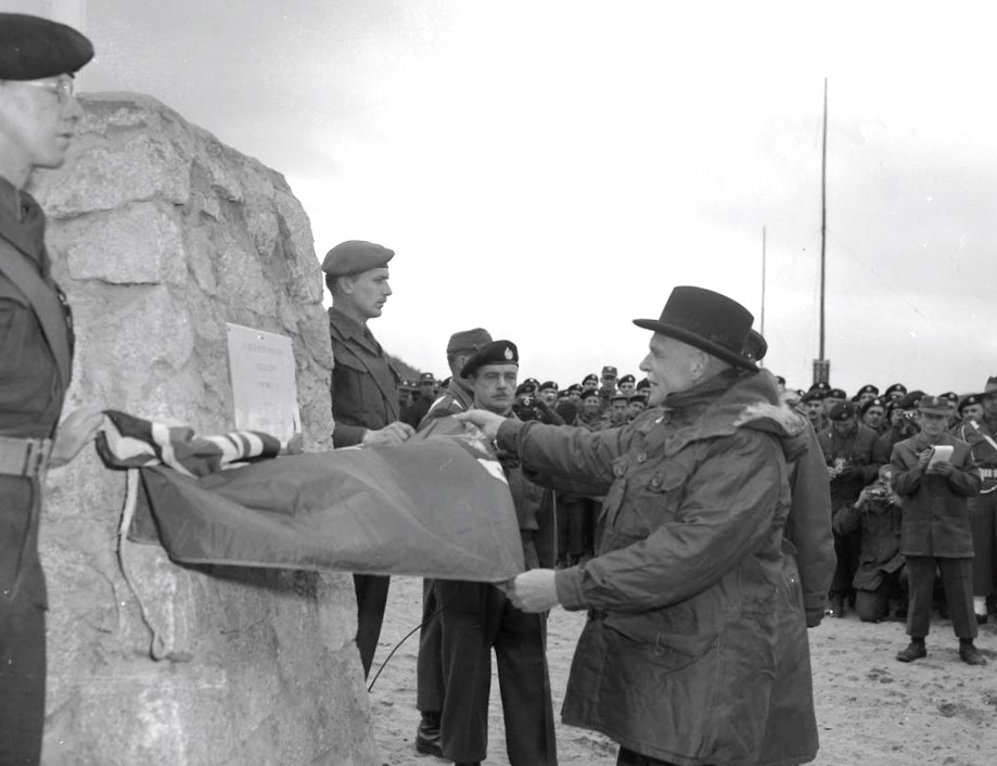 )Prime Minister St. Laurent unveils a monument at Maple Leaf Park in Korea, March 1954.