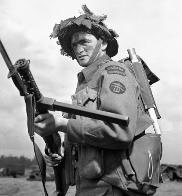 Able Seaman Armand Therien of the Royal Canadian Navy Beach Commandos, armed with a Lanchester sub-machine gun, England, 20 July 1944.