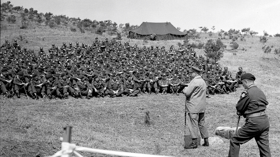 Major-General M.M. Alston-Roberts-West, G.O.C. 1st Commonwealth Division, thanking personnel of the 1st Battalion, RCR, on completion of the unit’s service in the Far East, 22 March 1953.