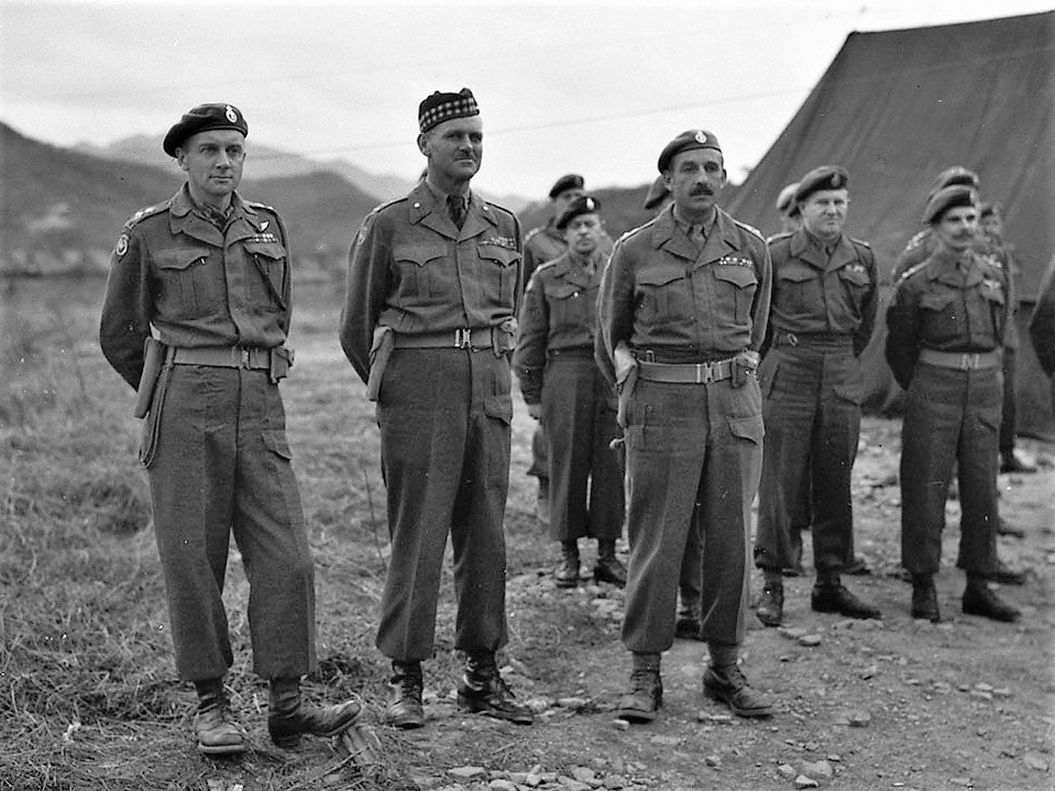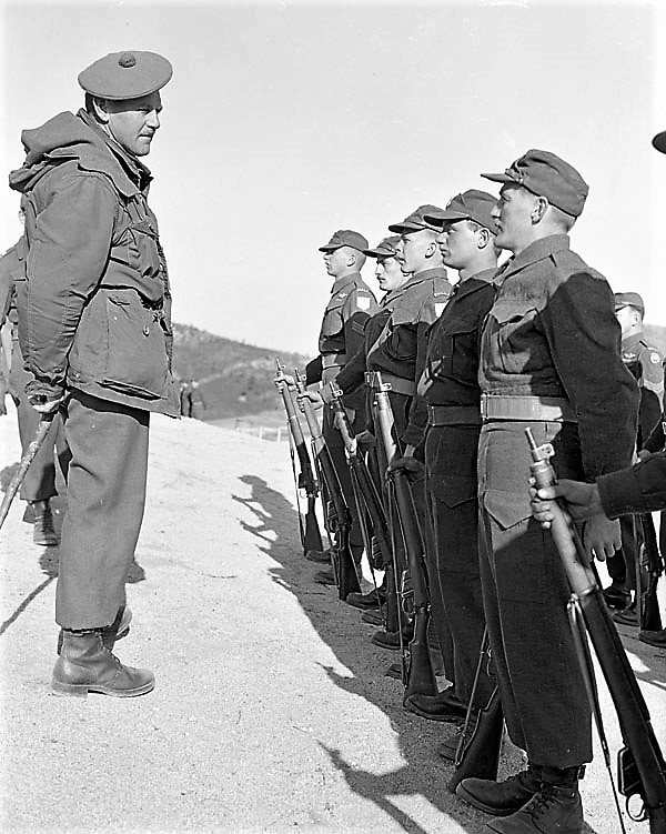 Changeover parade in Korea, 2nd Battalion to 1st Battalion PPCLI. Watching the band are (L.-R.:) 1st Bn CO LCol N.G. Wilson-Smith, Brigade Commander Brigadier J.M. Rockingham, 2nd Bn CO LCol Jim Stone, 5 November 1951.
