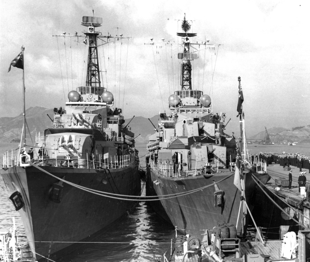 HMCS Athabaskan (219), left, and HMCS Crusader (228), at a jetty in Kure, Japan.  HMCS Crusader had been in Korean waters for eight months, while HMCS Athabaskan was on her third tour of Korean duty.