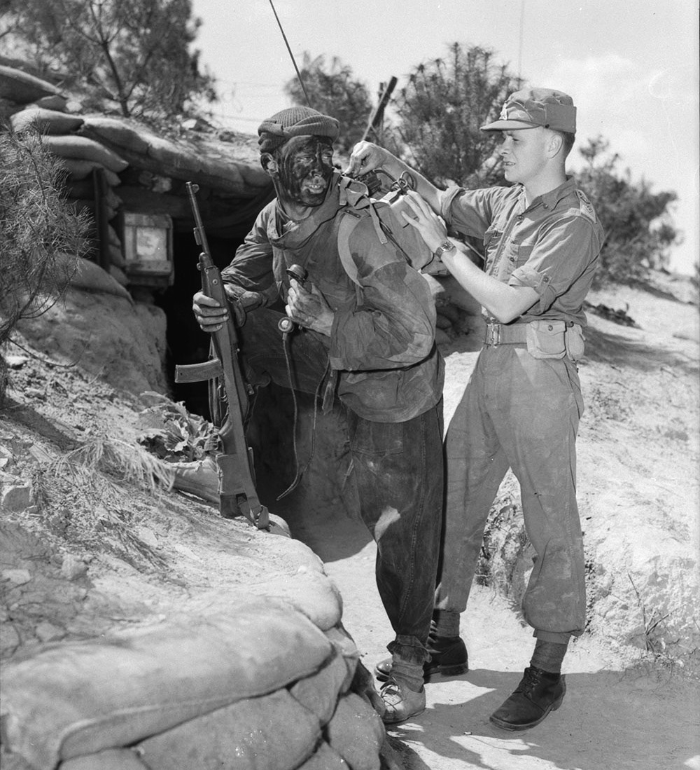 Royal Canadian Corps of Signals (RCCS) in Korea. Lt. Paul Ranger checks Pte. Jean-Guy Lacroix’s wireless set as he prepares for night patrol with soft shoes, dark clothing and a black face make-up, 14 June 1952.