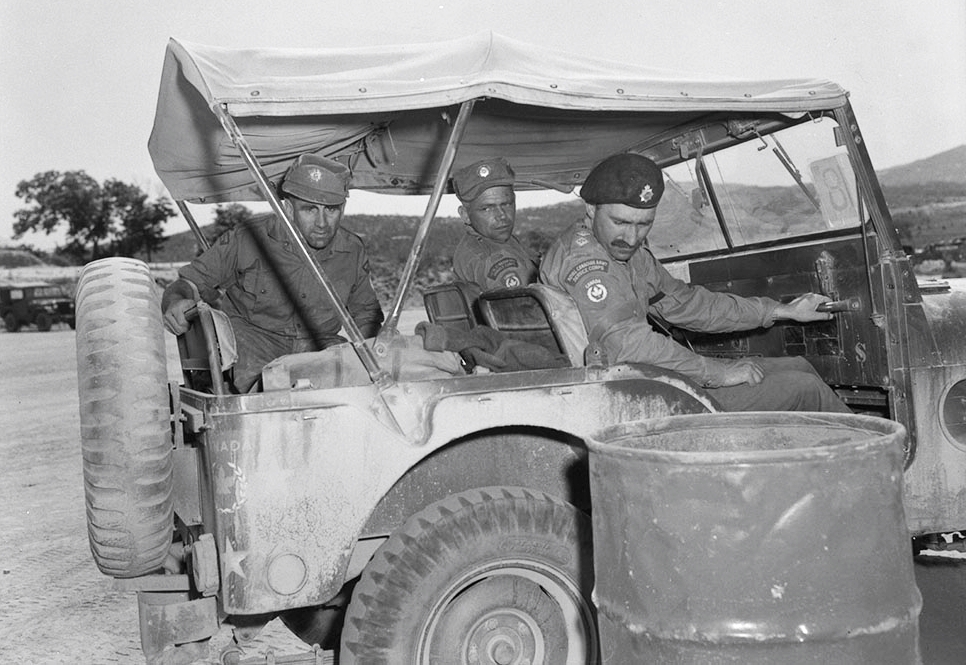 Canadian personnel of the 1st Commonwealth Division competing in jeep rally. Left to right: Pte. Frank Bevins, Lt. Edward Blake, Cpl. Herb Read, Korea, 23 June 1954.