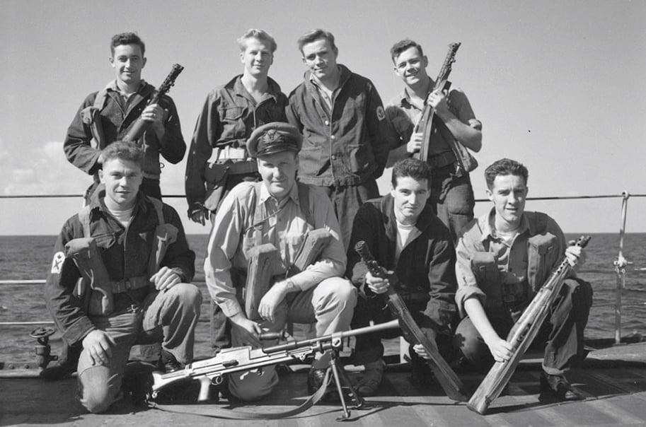 RCN in the Korean War, No. 2 Sam Pan Boarding Party on HMCS Nootka. Front row: L/STO D. McCoy, LT/CDR F.P.R. Saunders, ABSM M. Messervey, L/SCV W.F. Wickson. At the back: ABTD W. Murray, LSCR G. Mason, LSCR R. Hornecastle, ABCR J. MacKinnon, 7 July 1952. The boarding party is armed with a Bren Gun and Lanchester sub-machine guns.