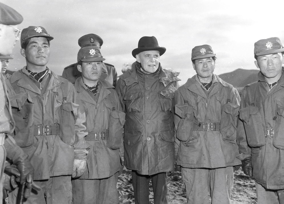 1st Battalion of the Royal Canadian Regiment presenting arms as U.S. President Dwight D. Eisenhower arrives for a visit to Korea.  During the presidential campaign of 1952, Republican candidate Eisenhower was critical of the Truman administration’s foreign policy, particularly its inability to bring an end to the conflict in Korea.  President Truman challenged Eisenhower on 24 October to come up with an alternate policy.  Eisenhower responded with the startling announcement that if he were elected, he would personally go to Korea to get a firsthand view of the situation.  The promise boosted Eisenhower’s popularity and he handily defeated Democratic candidate Adlai E. Stevenson.  Shortly after his election, Eisenhower fulfilled his campaign pledge, and as shown here, went to Korea.
