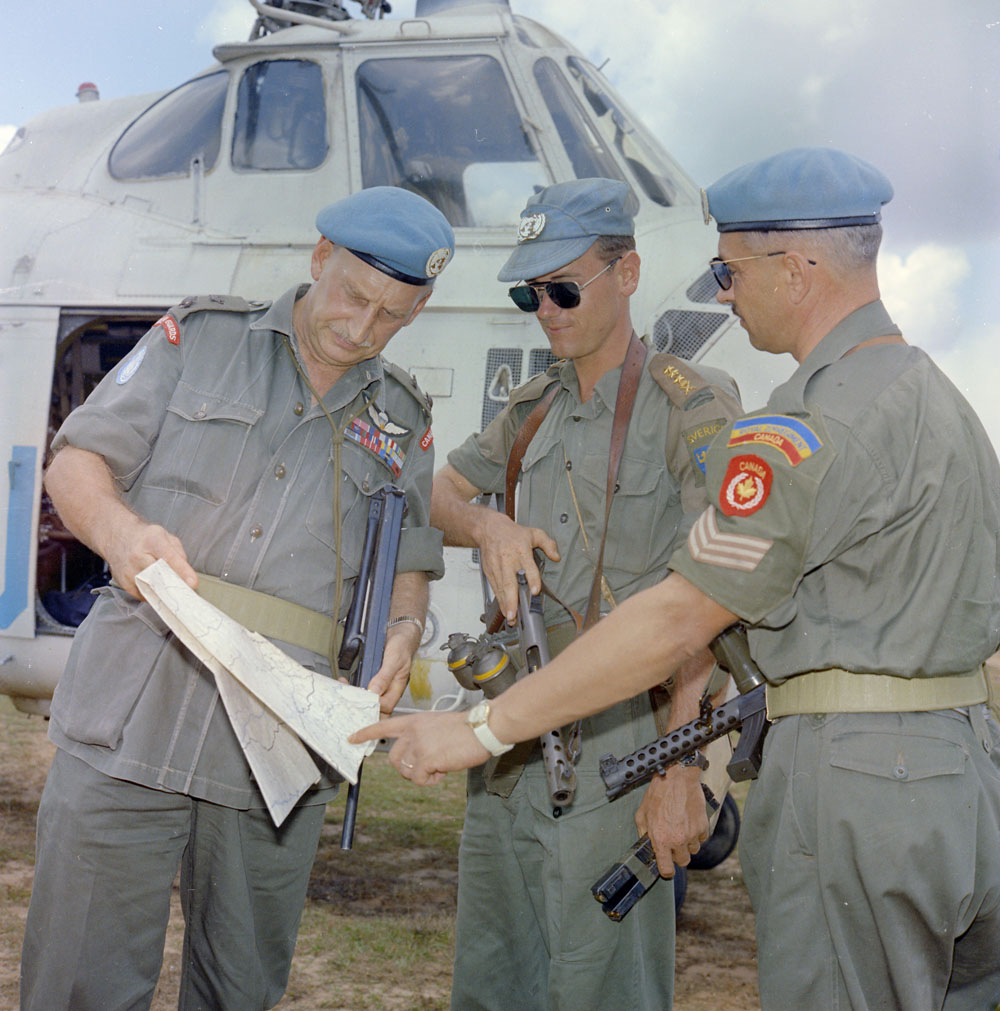 Canada’s first military efforts in Cambodia began in 1954. About 30 Canadians went there as part of the International Commission for Supervision and Control (ICSC) to help enforce the Geneva Accords. This military mission helped French Indochina transition to becoming three new countries—Cambodia, Laos and Vietnam. In Cambodia, Canadian peacekeepers played several roles. They helped maintain order and supervised the withdrawal of French colonial forces and those from neighbouring countries. The mission’s international personnel watched for border violations in the volatile region. They also monitored the first elections in Cambodia as a new country.