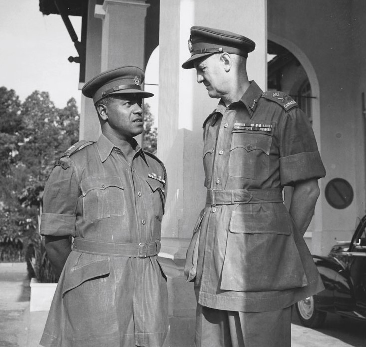 Indian Major P. V. Ramchandran and Canadian Major-General Ted O’Snow, Canadian Military Advisor, in front of the Hotel Royal, Pnom Pneh, Cambodia, May 1955.