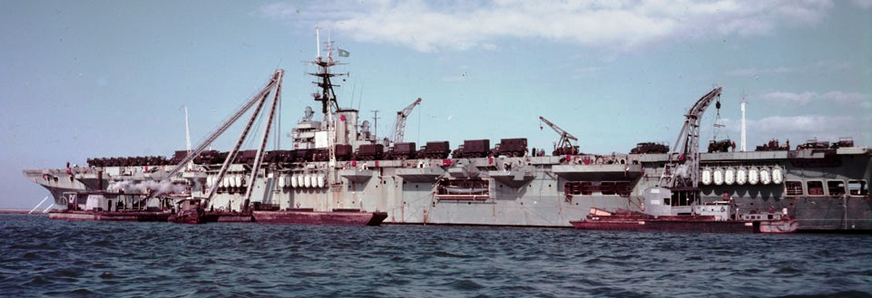 HMCS Magnificent (CVL 21), unloading Canadian Army vehicles, Port Said, UNEF, 13 Jan 1957.